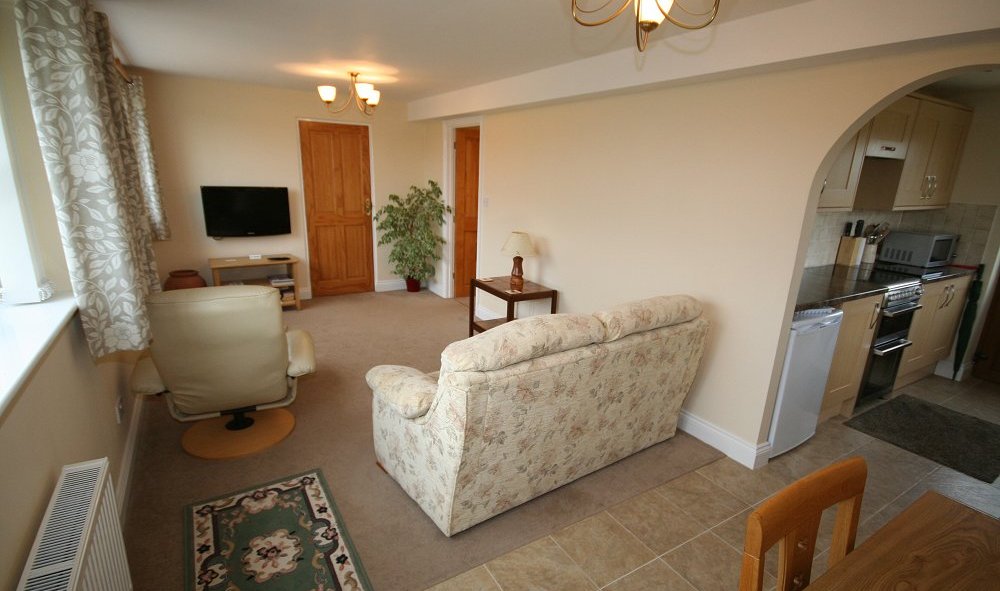 The large lounge has a dining table and chairs at the kitchen end, and a very comfortable 2 seater sofa, from which you can enjoy watching the Flatscreen Digital TV.